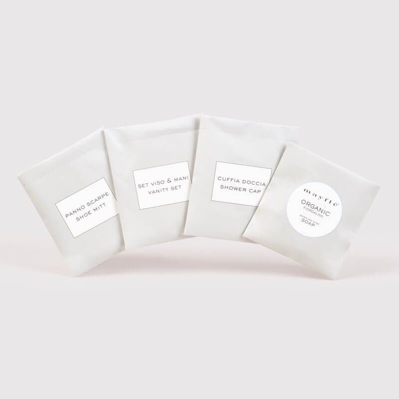 - Confezione: i kit vanity Mayflè sono confezionati in comode bustine di carta e sono venduti in confezioni da 100 pezzi e multipli.